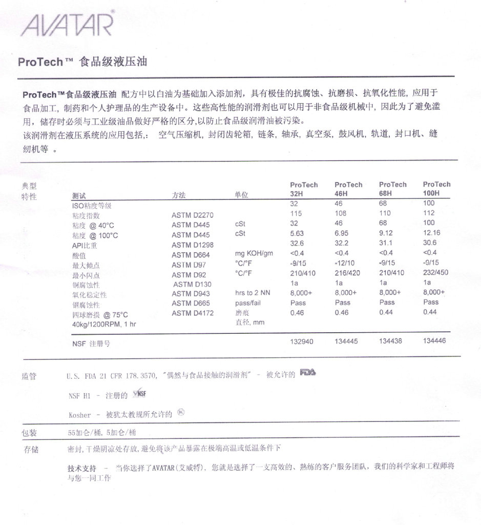AVATAR艾威特ProTech™32H食品级液压油美国进口5GAL