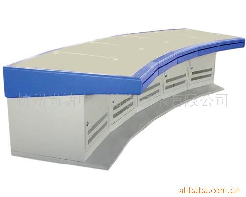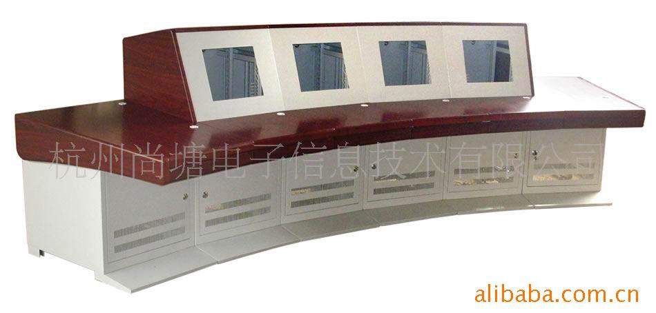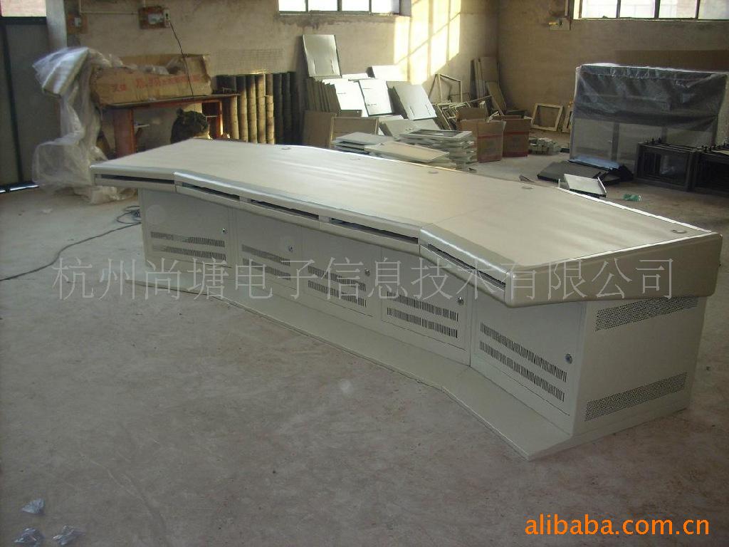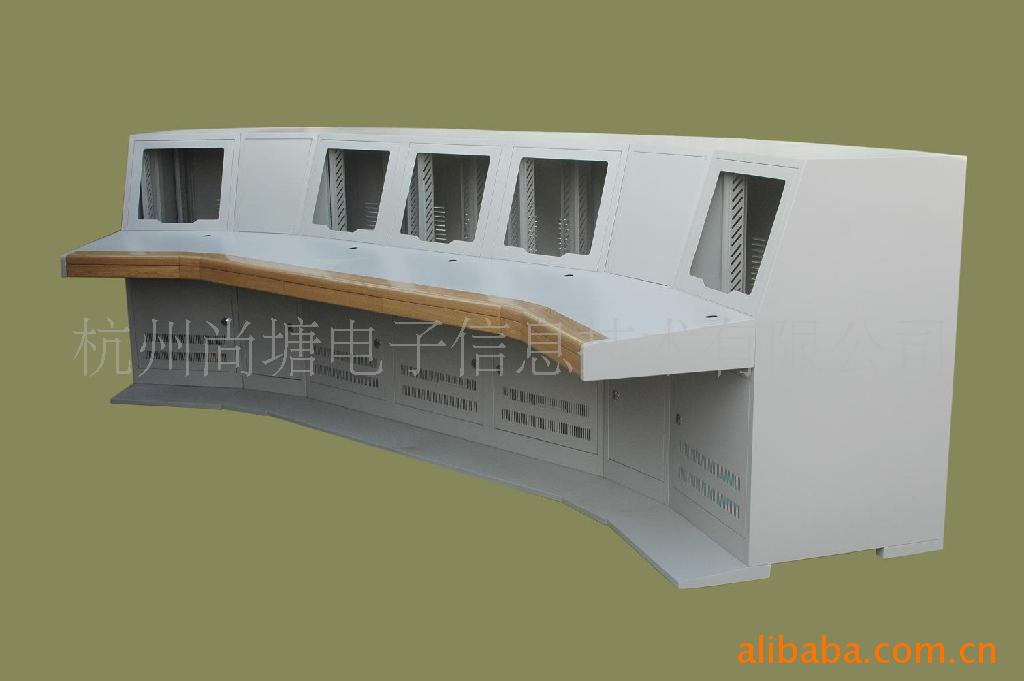 杭州尚塘电子生产单联、双联、三联、四联、多联体控制台按人机最佳配合尺寸设计,符合人体工程学理论要求。具有结构合理、工艺先进、色彩协调、安装方便等特点。可以单独使用亦可多台连用,满足多种组合需要。顶面设计有平顶式(普通版)和豪华版(顶面铝合金包边,台为密度板包边简称钢木结构),工作台面的长度可以根据用户的要求进行设计。适用于广播电视、闭路监控、指挥中心等多种行业。