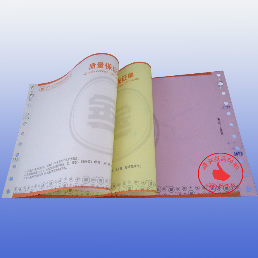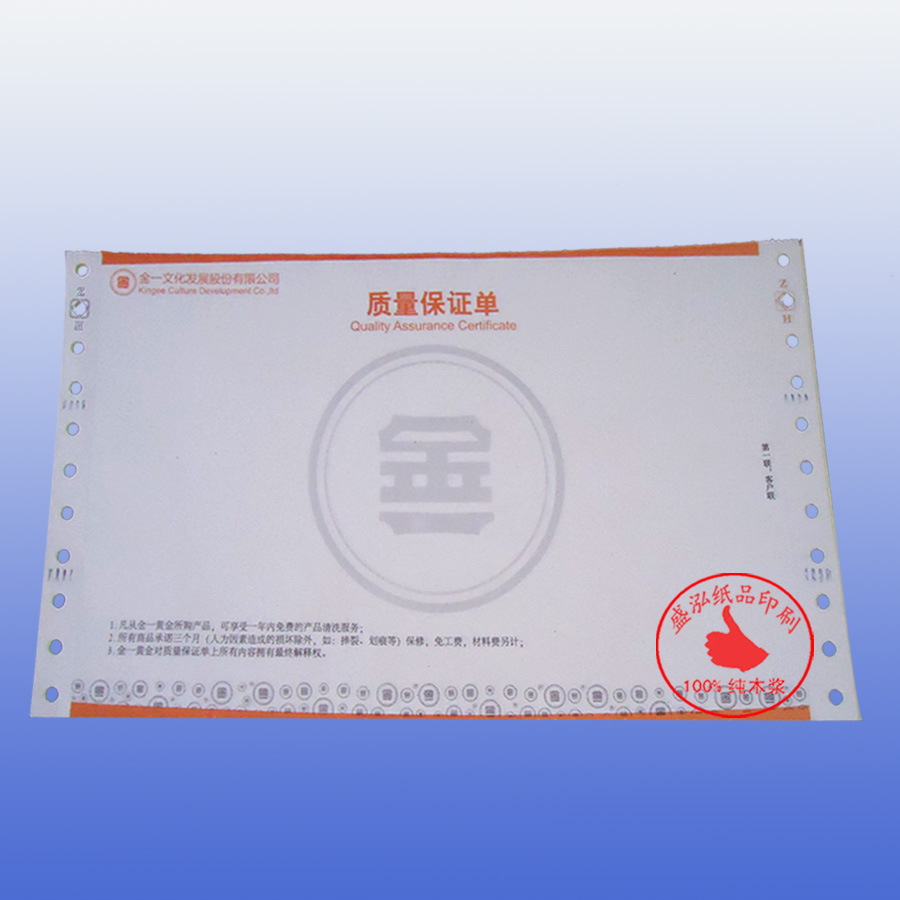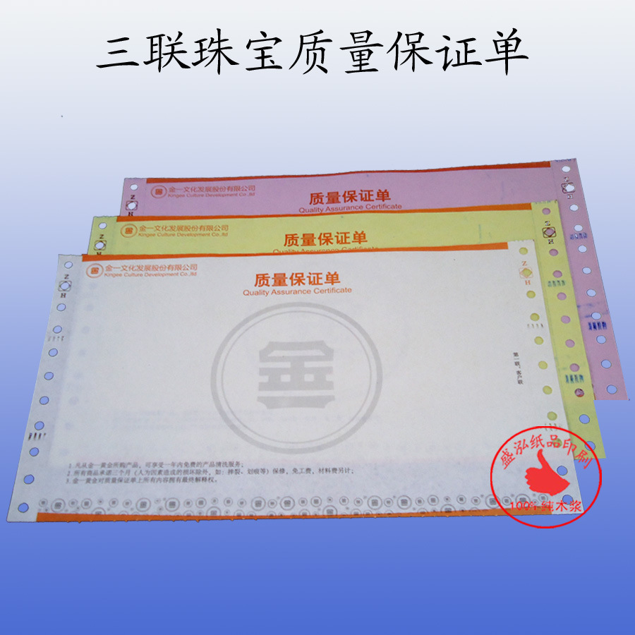 珠宝质量保证单 珠宝质量保证单一般采用上纸75g,下纸50g的两联无碳纸复写纸,其中联有背印,打码,纸质厚实平挺,洁白不透光,复印过机顺畅,不跟纸,不卡机,碳粉粘着性好,效果清晰,长期以来,作为我公司一款中高档主力产品,得到市场的普遍欢迎,在价格方面具有相当优势,明显的色彩区分,使打印的内容更方便校阅。产品印刷看起来高档,大大提供了企业的形象。适用范围:作为珠宝店的销售质量保证凭证,销售收款收款收据