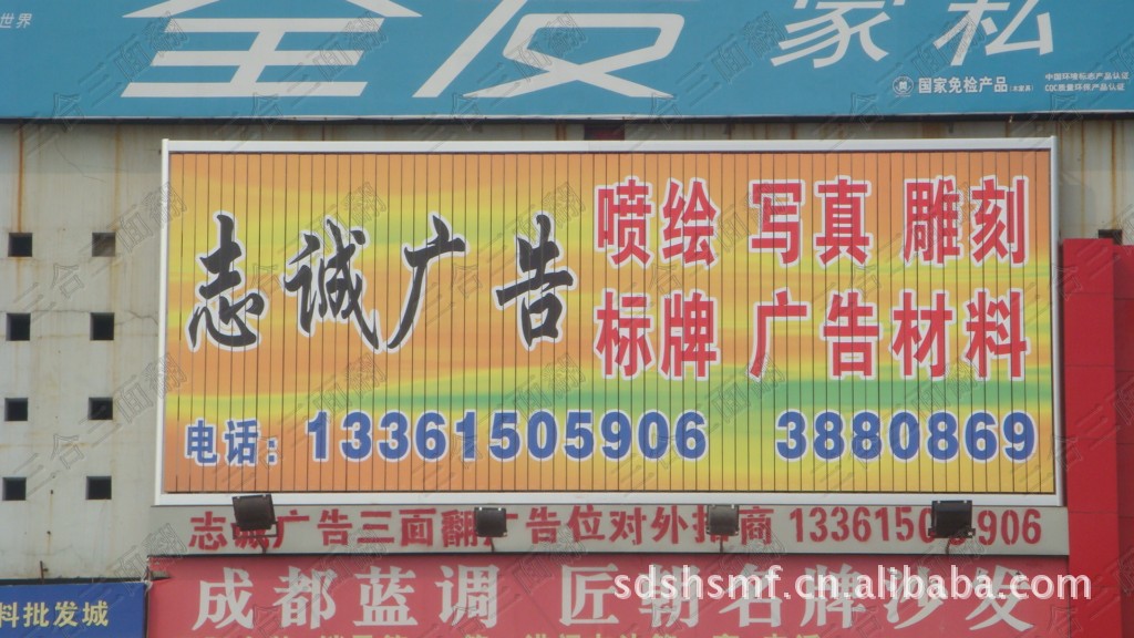 枣庄市三合广告机械设备有限公司生产基地位于山东革命老区---枣庄,公司拥有雄厚的技术实力和强大的生产能力,加上一群锐意进取、不断创新的工程师和团结合作的技术工人,不断推出各种新型耐用的三面翻广告牌。三合三面翻主要部件采用德国先进技术,通过五代技术改良,原材料产地经过精心选择。用“四合格”标准来确保客户产品的安全运行及可靠。即“原料加工合格”、“组装安装合格”、“调试验收合格”、“售后服务合格”,精益求精,不断完善,竭尽全力打造“三合”强势品牌。