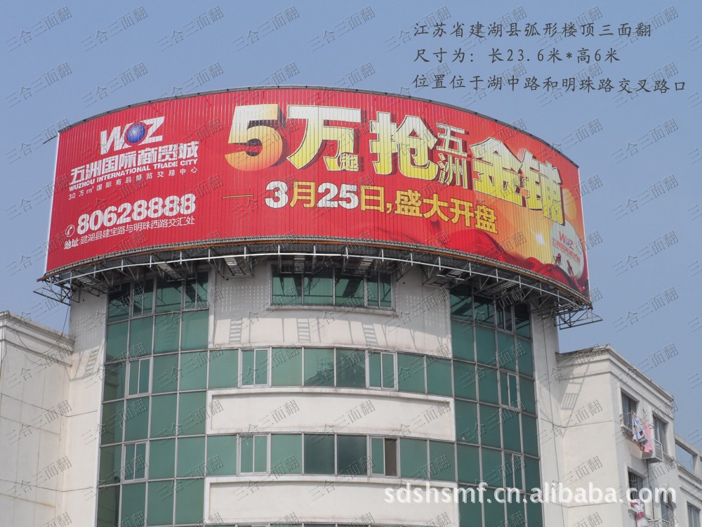 枣庄市三合广告机械设备有限公司生产基地位于山东革命老区---枣庄,公司拥有雄厚的技术实力和强大的生产能力,加上一群锐意进取、不断创新的工程师和团结合作的技术工人,不断推出各种新型耐用的三面翻广告牌。三合三面翻主要部件采用德国先进技术,通过五代技术改良,原材料产地经过精心选择。用“四合格”标准来确保客户产品的安全运行及可靠。即“原料加工合格”、“组装安装合格”、“调试验收合格”、“售后服务合格”,精益求精,不断完善,竭尽全力打造“三合”强势品牌。