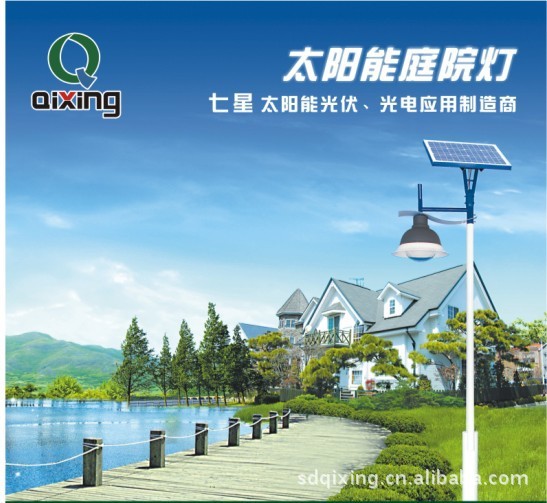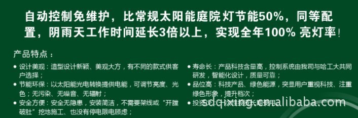 太阳能庭院灯是属目前最环保的绿色照明产品之一。采用高效单晶(多晶)硅太阳能电池供电,高性能、免维护太阳能专用电池,光源采用大角度蝙蝠翼形超高亮LED、智能化低能耗控制电路、过充、过放保护,自动光照度控制,性能安全可靠、节能、经济、环保、使用寿命长。(太阳能电池可用25年,蓄电池可用5年以上)是未来照明的发展方向和照明灯具中的一支新秀。蓄电池容量大,太阳光照射一天,可照明整个晚上,且一个月的照明时间允许20阴雨天以上正常工作,真正实现全年亮灯率100%。产品美观、坚实、安全,安装方便。