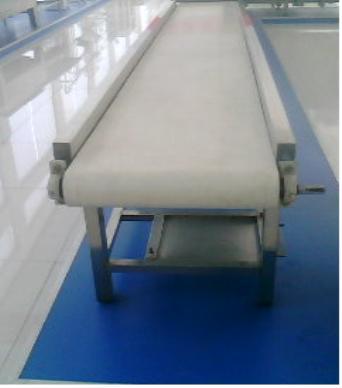 2、技术参数:主架采用50*50*2.0mm的不锈钢方管,托轴采用直径38*1.5mm的圆管加尼龙堵头制作,皮带采用白色3毫米厚3线两胶的尼龙食品专用带,电机采用1.1kw电机,电机位置为皮带机下方,手动调速,链条传动,带不锈钢电控箱。皮带与主架上沿距离30mm,;4排腿