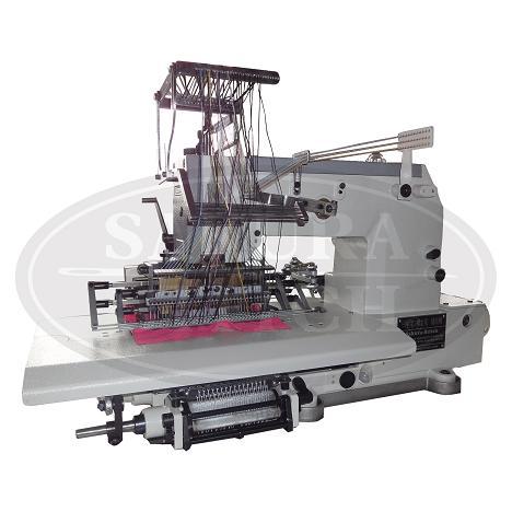 特点:此机上线采用普通线,下线采用松紧线。运用多款式样的凸轮花盘,再与装饰线互相搭配,创造出种类繁多且吸引人的花样图案。适用于女裙打褶,连衣裙等腰边松紧打褶,对于各种童装,床上用品的装饰缝,亦可选择配置不同的花盘,缝出想要的图案。