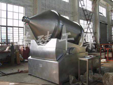 EYH型二维运动混合机产品概述 EYH型二维运动混合机主要由转筒、摆动架、机架部分构成。转筒装在摆动架上,由四个滚轮支撑并由两个挡轮对其进行轴向定位。在四个支撑滚轮中,其中两个传动轮由转动动力系统拖动使转筒产生转动,摆动架由一组曲柄摆杆机构来驱动,曲柄摆杆机构装在机架上,摆动架由轴承组件支撑在机架上。EYH型二维运动混合机广泛用于医药、化工、食品、染料、饲料、化肥、农药等行业尤其适用于大吨位(1000L~10000L)各种粉、粒状物料的混合。EYH型二维运动混合机设备特点 EYH型二维运动混合机的转筒可同时进行二个运动,一个为转筒的自转,另一个为转筒随摆动架的摆动。被混和物料在转筒内随转筒转动、翻转、混和的同时,又随转筒的摆动而发生左右来回的掺混运动,在这两个运动的共同作用下,物料在短时间内得到充分的混和。混合筒的出料带有螺旋叶片,使混合机具有混合迅速、混合量大、出产便捷等特点。EYH二维混合机适合所有粉、粒状物料的混合。本设备经过我公司技术改进使用双臂传动,比一班单臂传动稳。特大吨位混合双臂传动效果比较明显。EYH型二维运动混合机工作原理