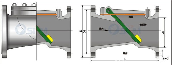 橡胶瓣止回阀主要由阀体、阀盖及橡胶瓣三种主要零件组成。其中橡胶瓣由钢板、钢棒及强化尼龙布做衬底,外层披覆橡胶制成,阀瓣开关寿命可打100万次。该阀采用全流面积式设计,具有水头损失小,不易堆积杂物,维修简便等特性。该阀主要适用于排水系统,可安装与水泵出口处,以防止倒流及水锤对泵的损害。该阀还可安装在蓄水池进出水管的旁通管道上,以防止池水倒流至给水系统中上海人民阀门021-62187727。