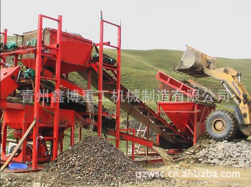 工作流程:由装载机为料斗上料—经传送带传料之滚动筛—筛分后粗料排掉--细料进入旋转澄金毯选出重矿物—重矿物及入选金机选出毛金。