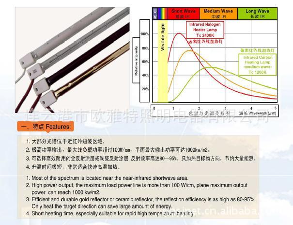 镀金红外线卤素加热管的优点如下这种镀金的红外线卤素加热管在国际市场上拥有领先地位,市场潜力巨大,很快将取得现在的卤素加热管,在点燃工作时光线比红宝石加热管更加柔和,除了没有氧气燃烧,保持新鲜空气外,还具有以下优点