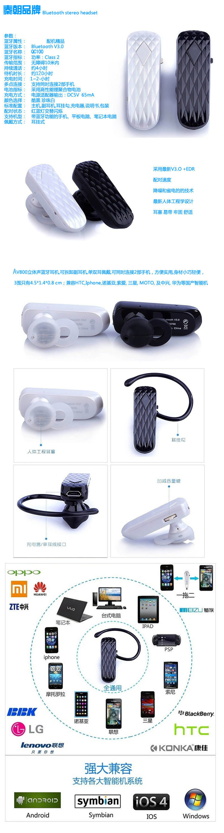 MY100品牌蓝牙耳机好产品定位高端,专为与众不同的您量身定制。蓝牙耳机支持的手机包括HTC、苹果、三星、诺基亚、摩托罗拉、LG、小米、魅族、华为、中兴、联想、天语、步步高、OPPO…… (手机有蓝牙功能就能用) 独特的设计,看上去带有质感,时尚的贵族气势,专为与众不同的自己量身定制! 支持一拖二可以同时连接2部手机技术领先行业! 此款无线耳机3大优势: 1.解决开车听电话!现在开车用手机打电话,已经成驾驶违规行为。有了无线蓝牙耳机,轻松方便接听电话。 2.解决带时间长耳朵会很不舒服!蓝牙耳机采用的是最轻最薄的材料做成。 3.解决通话听不清楚!此款蓝牙耳机通话清晰,音质好。 本款耳机支持一系列蓝牙数码手机产品:IPHONE苹果HTC三星小米摩托罗拉等任何有蓝牙功能的手机通话和听歌。现特价首发:高雅的造型+完美的音质+秒杀一切立体声蓝牙耳机的价格!(注:副耳机为入耳式圆头) (此款无线蓝牙耳机可做为车载蓝牙设备,可接听电话功能。2013年交规严格,出行就用无线蓝牙耳机,接听电话方便、安全,避免罚款扣分。不过店主认为开车期间接听电话难免影响注意力分散,还是妨碍安全驾驶的行为。为了你和他人的安全,尽量少打哦。)关爱生命,从关爱自己做起哦