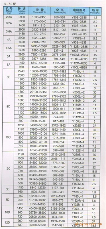 4-72型属中压大流量通用离心风机,其气动性良好,效率高,噪音低,主要用于工厂及建筑物的通风换气,亦可与其他各种机械配套,作气体气循环,强力干燥,通风换气,降温除尘等用途。