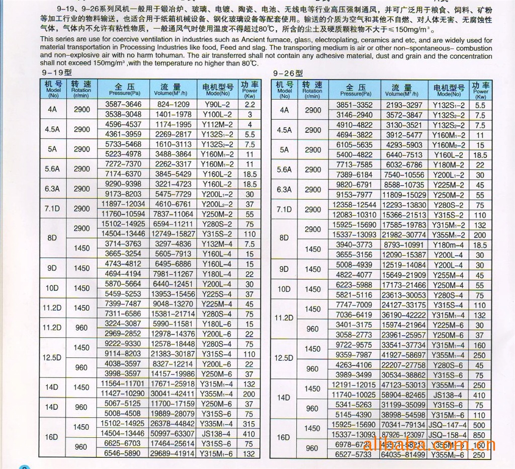 七、 单机产品成套供应范围 风机1台,配套电机1台,地脚螺栓1付( №4~6.3配4套,№7.1~16以上配8套),联轴器1套( №7.1~16 )。