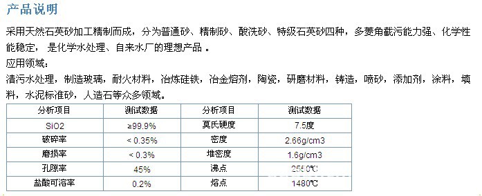 我们是生产石英砂的专业厂家,主要产品有过滤水用石英砂,污水处理用石英砂,保温用石英砂,玻璃用石英粉,砂浆用石英砂,防火材料用石英砂,陶瓷用石英砂,新型建材、节能材料用石英砂,铸造用石英砂,喷砂除锈用石英砂,油井用石英砂,地坪用石英砂等多种系列产品。型号有70-100目,40-70目,20-40目,8-16目,5-7目,4-6目等等,
