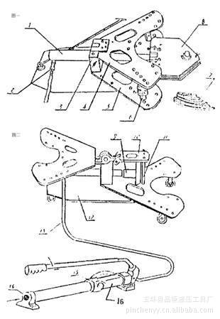 由手动泵(电动泵)(16),,快速接头(2), 工作缸(1),方档块(3) ,上花板(4),下花板(5),辊柱(6),R模板(7),夹板模头(8),直角模头(9),联杆板(10),销子 (11),小车(12),高压输油管(13)等组成。