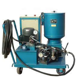 三、使用说明 1、将液压站油箱内加足2/3液压油,加油时一定注意清洁。 2、您可以根据设备润滑要求,选用锂基脂或钙基脂及二硫化钼润滑脂,要求针入度不低于265(25c150g)1/10mm。 3、接通电源,电机转向按顺时针旋转,打开油枪即可工作。工作时绿灯亮,关闭油枪停止工作,此时红灯亮 4、出油量可调,将两接近开关距离加大,延长换向时间,出油量减小,反之出油量增大。出油压力可调,将液压溢流阀减小,出油压力同时减小,正常 情况下液压表在25MPa为宜。出油压力正常调在30MPa停止工作,如需调整时将压力继电器调压阀增大或减小。 四、注意事项 1、油脂一定要清洁,不能含有有杂质硬块 2、不能随便调整溢流阀和压力继电器,以免影响正常工作 3、长期不使用时请将电源关闭,同时打开油枪进行卸压,以免长期保压损坏油路、油枪及压力表 4、流动车盘下的接地链条一定保持正常,以免出现漏电造成事故 五、故障及排除方法 油泵接通电源不工作 | 检查指示灯,如果红灯亮,打开油枪即可工作 | 电机工作,液压系统不工作 | 1、电机转向反转,更正转向 2、液压压力表小于1.5MPa,调节溢流阀压力至2.5MPa即可工作 3、接近开关位置出现移位,将接近开关复位(接近开关探头距感应盘不大于6mm | 电机、液压系统正常工作但不出油 | 柱塞内有气体存在,将贮油桶压实,卸下油路排气至正常出油后再将管路复位。 | 关闭油枪后不停车 | 1、压力继电器调压偏高,需打开溢流阀,降低调压阀压力,增加溢流阀压力 2、油路漏油造成不保压,更换油路 3、单项阀堵塞,请清洗单项阀