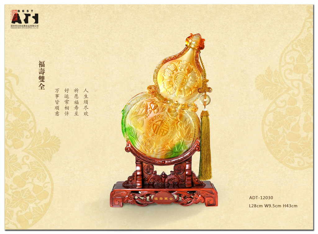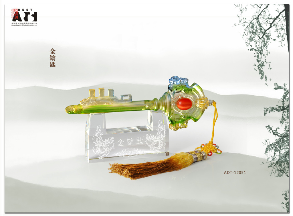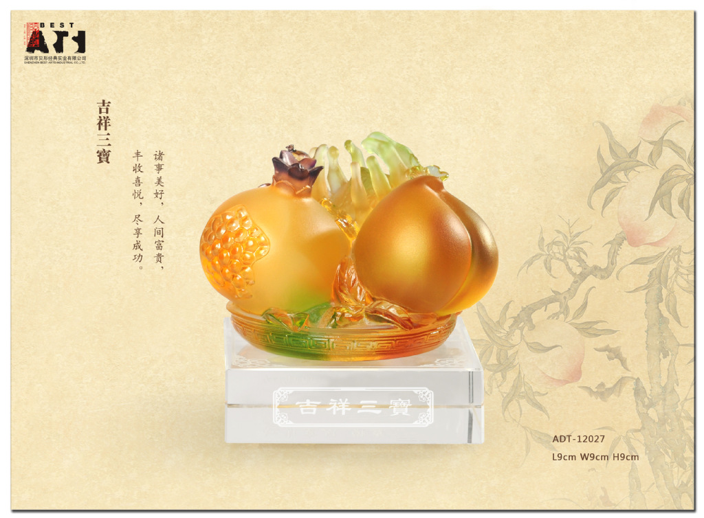9、精选原料:为精确控制各种颜色的比例与流动的美感,需依造型与设计精挑特定颜色与大小的玻璃原料并安排色块的分布位置。 10、进炉烧结:清模去尘后,将整个石膏模与配置好的玻璃料,放进炉内慢慢加温到850度左右,使热熔的水晶玻璃软化如麦芽糖,缓慢地流入石膏模内成型。 1