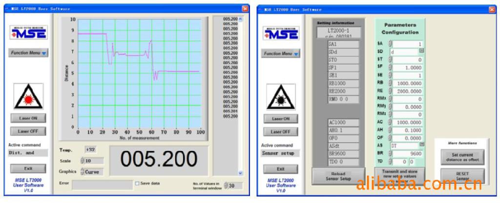 上面是调试软件的主画面。画面左侧是功能栏,点击图标按钮执行相应的功能。画面右侧是图形、数据显示部分:中心左上方以曲线方式显示测得距离值,最右侧实时显示测得距离之数值。下方以大字显示实时距离值,同时还显示测距仪内部温度值,距离数值的范围,曲线/图形显示方式选择,故障信息、数字显示距离值的个数等。