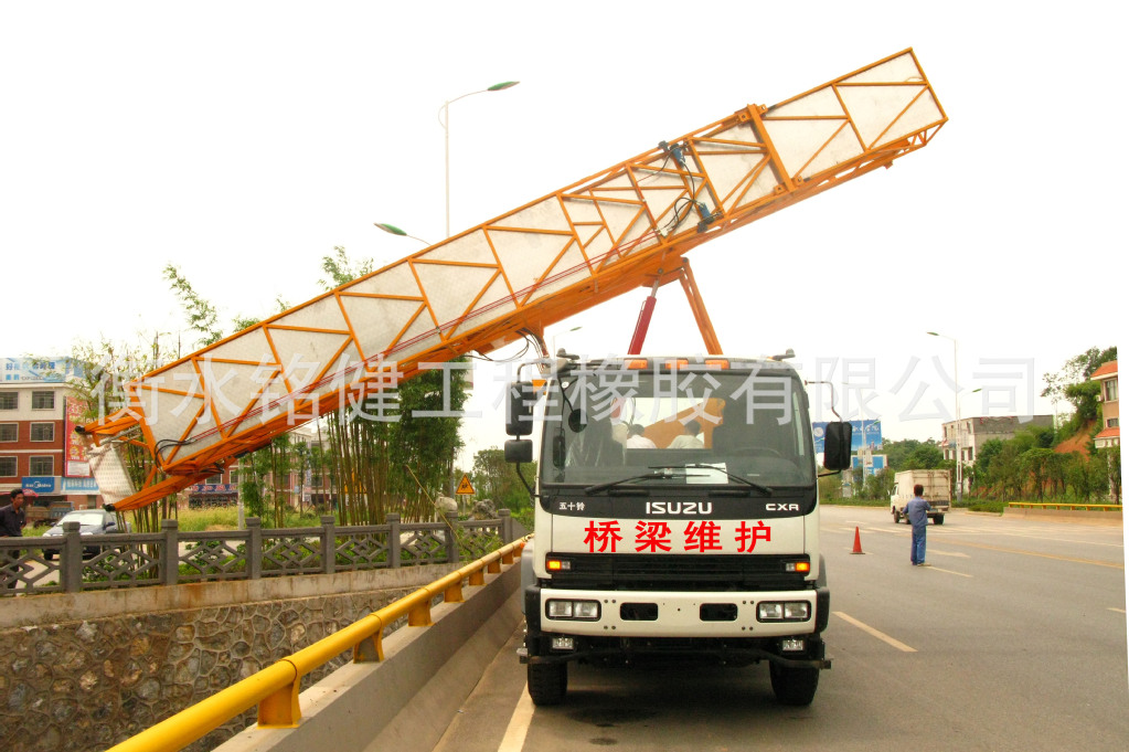 吊篮式桥梁检测车 吊篮式桥梁检测车也称折叠臂式桥梁检测车(如下图),其结构小巧,受桥梁结构制约少,工作灵活,既可检测桥下也可升起检测桥梁上部结构,可有线/无线操作,灵活方便,有时候还可以作为高空作业车使用,价格相对桁架式桥检车低。其基本结构充分体现了折叠臂式随车起重运输车、高空作业车的特点。