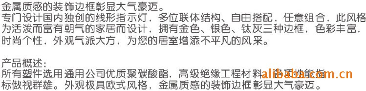 本公司坚持品牌战略,“米兰国际”品牌始终如一,产品涵盖全面,目前86型暗装(10余个系列)、86型明装(2个系列)、118型(10余个系列)、电器附件(防水盒、暗线盒)等等,详见产品相册。公司保持每年至少两款新产品上线,以符合广大消费者的需求,新产品富有个性,更有其独特的卖点!