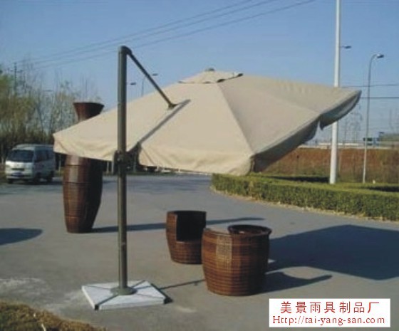 7)特点:遮阳效果更好,可360度水平旋转,90度垂直旋转,伞面利用率大,(伞面前倾斜度大,伞下的面积也大).操作方便(通过手柄控制转动和升降的,省力更省心)