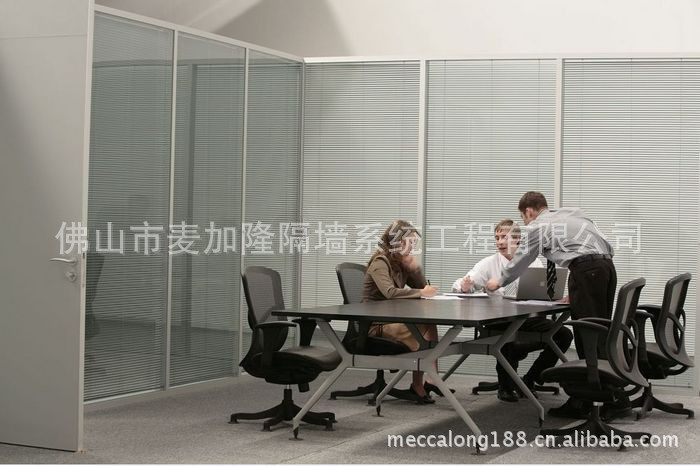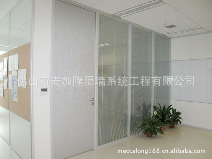 麦加隆双层隔断采用统一铝制型材框架系统。可装配不同的饰面材料实现室内透光、 板材饰面效果、磁性墙体书写等功能。