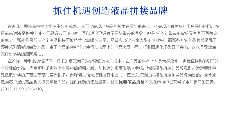 深圳市立信天成科技有限公司始建于2009年,作为美国优雅中国区合作伙伴,双方一直本着优势互补的原则,致力于将美国先进的安防产品和监控技术引入中国; 在行业低迷,竞争异常激烈的环境中,深圳立信天成坚持产品的高端定位,做精品,做优质品,每一款产品不管是外形设计到技术含量,完全秉承美国优雅的一贯风格,用产品的实力说话;在厂商如云的中国视讯行业异军突起,将优雅“RAKAH”品牌成功定位在国内一流品牌地位,并被新浪、搜狐、网易等知名媒体誉为中国视讯业的一匹黑马。 深圳立信天成科技有限公司拥有广泛的上游供应商资源,并成为“三星”、“LG”、“AUO”、“奇美”面板的核心分销商;2011年获得世界顶级光学触摸屏“XAT”品牌大中华区的代理权,台湾XAT融合日本光学触控先驱Xiroku技术团队和多项国际专利,在公共信息广告牌,交互式电子白板等新兴领域占有主导地位; 优质资源的整合提高了深圳市立信天成科技有限公司在行业内的核心竞争力,奠定了为顾客提供更优质产品和服务的坚实基础。 2012年10月,深圳市立信天成科技有限公司取得了美国“RAKAH”品牌在中国区域的永久使用权,相信美国先进的安防技术在深圳市立信天成科技有限公司的全力推动下,美国优雅一定会在中国视讯行业的各个领域发扬光大,成为经久不衰的百年品牌。 |