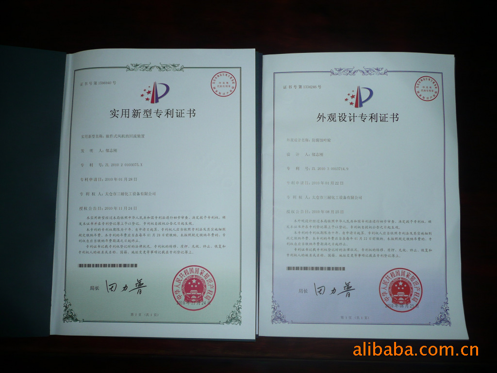 公司研发的整体塑料叶轮已申请发明专利,目前已获得多项专利证书。并与2004年5月11日通过了ISO9001;2000及2007年7月1日 ISO;2008质量体系认证证书。并获得重合同守信用企业、苏州市名牌产品等等。