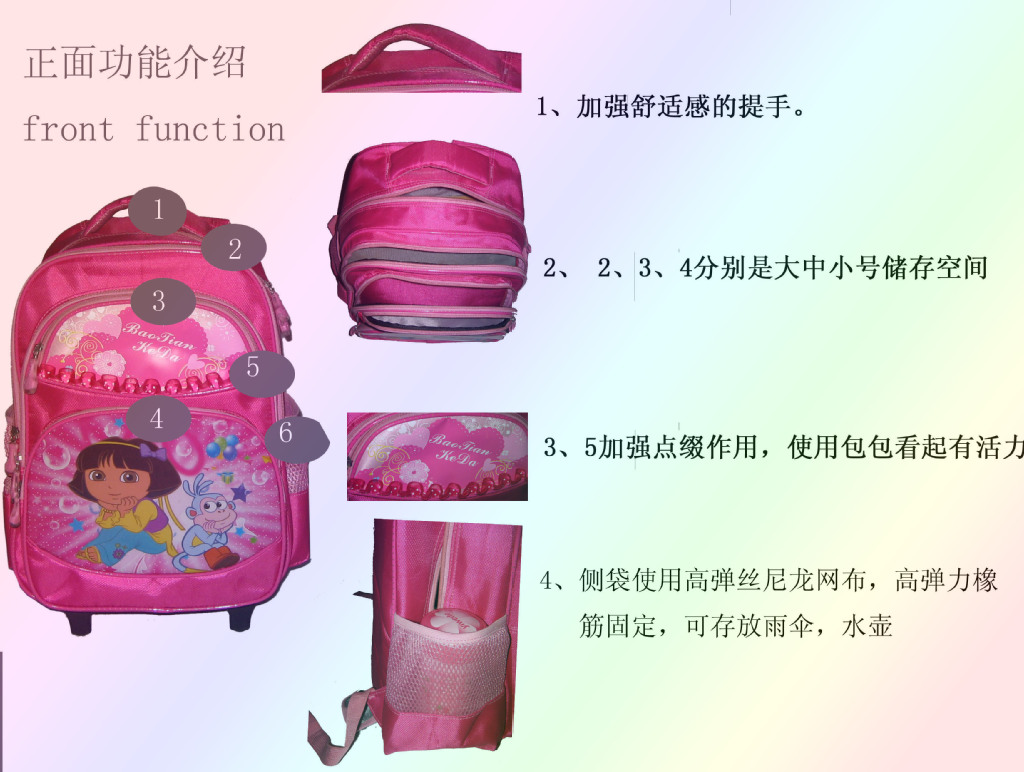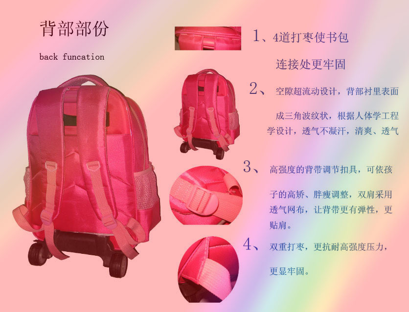 4、 湖南省邵东县爱心箱包有限公司经过10多年的发展,专注于书包、背包领域,原材料经过严格检测,不合格不入厂,成品经过9道检测才可以出厂(如:面料是由高密度高韧度的尼龙布和PVC材料组成,色泽鲜艳,防水耐磨,健康环保。拉片是用金属制成,永不生锈。拉链更是经过上千次的润滑测试。)本着以"高品质、高标准、高效率"为基准,以"健康、环保、减负,美观"为设计理念,世界领先的生产设备,AIF的质量细节品控、流水式作业每天能提供2000个优质产品。产品远销欧美国家及国内一、二级城市。纵观中国书包市场,无强势品牌、质差价高、经营混乱、销售方式单一,作为爱心箱包2012年将完成对上游整个书包产业链的整合(生产企业、原料供应商,数量达到50家以上),这些资源,将爱心箱包的规模优势、产能质效、生产成本等得到更好的发挥,在营销通路上,