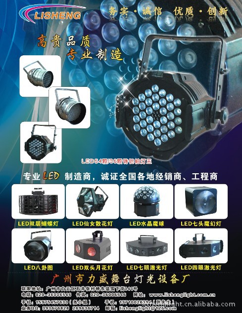 LED大功率帕灯/LED120颗3W帕灯/LED72颗3W帕灯/LED54颗3W防水帕灯/LED54颗3W大功率帕灯/LED36颗3W帕灯王/LED36颗3W防水帕灯/LED177/183/139颗&10灯珠帕灯/专业生产厂家广州力盛灯光02036006546 除了生产舞台帕灯还经营追光灯、摇头灯、激光灯、LED舞台效果灯、婚庆灯及户外演出照明灯光等的批发零售及外贸加工。力盛灯光产品款式新颖,价格合理,质量保证,品质一流,服务一流,"力盛"品牌,在业界享有一定的知名度。以其高性价比的产品,规范的市场操作,良好的售后服务,诚信为宗旨,从而得到各经销商与用户及同行的一致认同