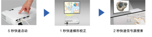 快速开机 从按下"Power"按钮到出现Logo画面仅需5秒时间,投影机自动检测垂直角度,并立即进行自动垂直梯形校正,校正时间仅需1秒。按下"Source Sesrch"按钮,投影机在2秒钟内自动搜索并识别信号源。 0秒关机 |