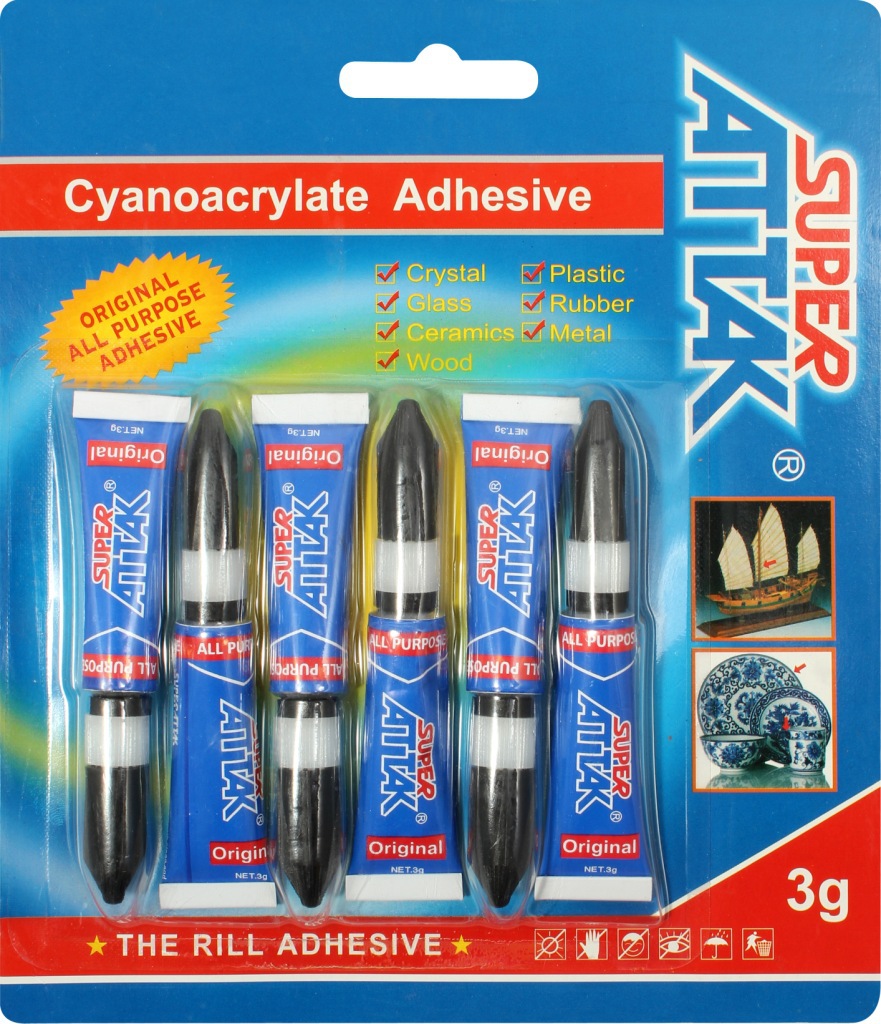 ATTAK是凌尔胶粘剂厂重点推出的另一个品牌该产品为无色透明液体, 操作方便,强度高.速度快.使用方便等特点.可用于电器零件.光学仪器.机械维修.模具定位.汽车部件黏结.文教用具.文物修补.竹木家具.玩具等的应用,该款具有使用反便,只要把盖子盖紧,铝管出口处即破,这样只要把最上面的黑色部分取下来,旧可以很方便的使用了,用完搽干瓶嘴,放在小孩不易拿到的地方,下次还可以使用。