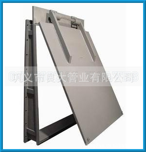 使用HDPE材料制造拍门,HDPE材料虽然具有耐酸碱腐蚀的特性,但强度较低;为了弥补这种材料强度的不足,加入强度高的钢材进行补强,通过特殊的工艺,在HDPE材料中内衬钢材,这样便保证了拍门的整体强度要求,使两种材料的特性相得益彰;如日常生活中常见的塑钢门窗便是很好的范例。