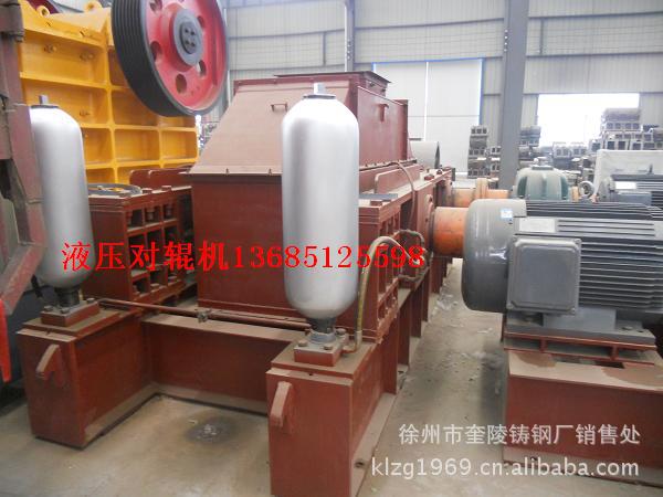 对辊机结构特征:1、该系列对辊式破碎机主要由辊轮组成、辊轮支撑轴承、压紧和调节装置以及驱动装置等部分组成。2、出料粒度的调节:两辊轮之间装有楔形或垫片调节装置,楔形装置的顶端装有调整螺栓,当调整螺栓将楔块向上拉起时,楔块将活动辊轮顶离固定轮,即两辊轮间隙变大,出料粒度变大,当楔块向下时,活动辊轮在压紧弹簧的作用下两轮间隙变小,出料粒度变小。垫片装置是通过增减垫片的数量或厚薄来调节出料粒度大小的,当增加垫片时两辊轮间隙变大,当减少垫片时两辊轮间隙变小,出料粒度变小。3、驱动机构是由两个电动机,通过三角皮带传动到槽轮上拖动辊轮,按照相对方向运动旋转。在破碎物料时,物料从进料口通过辊轮,经碾压而破碎,破碎后的成品从底架下面排出。