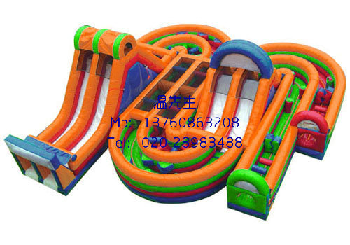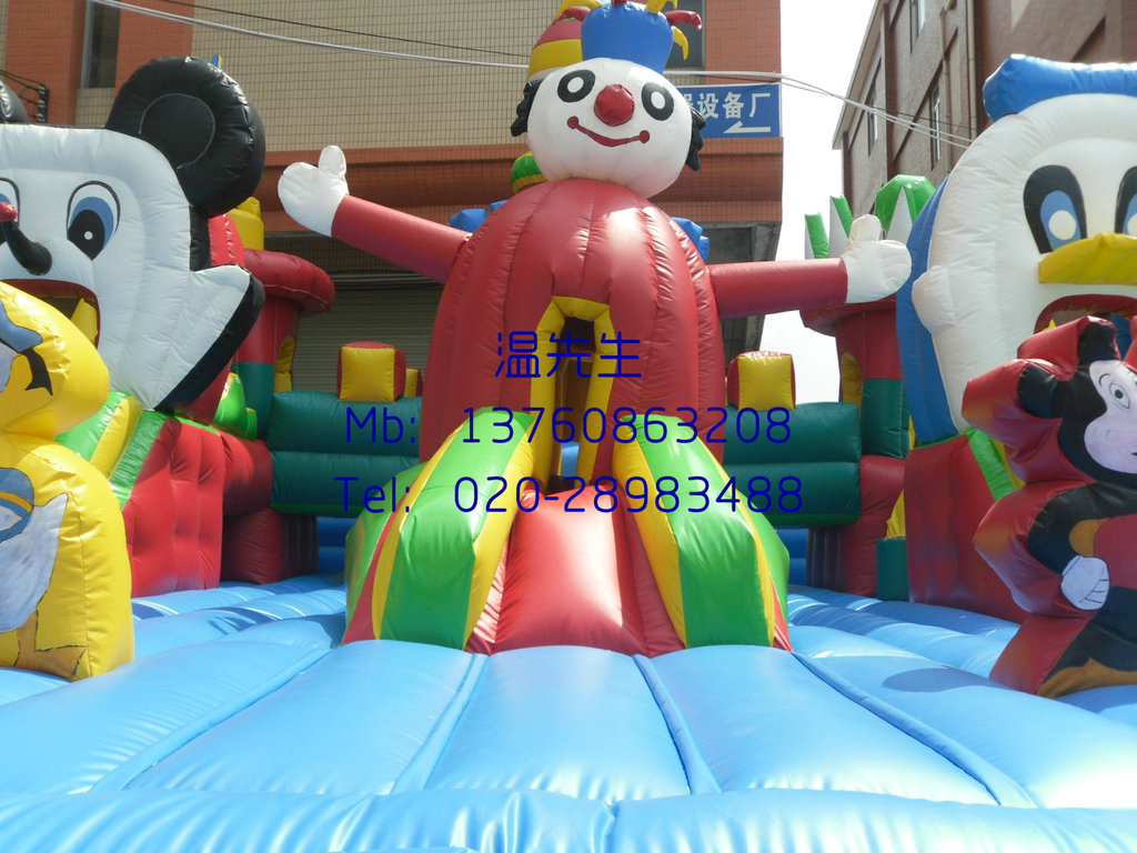 儿童充气弹跳城堡是当前非常流行、可玩性和安全性高、商业空间很大的一种娱乐设施和娱乐项目,它从儿童的生理和心理特性出发而研制,内含滑梯、蹦床、攀岩、迷宫、各式各样的形象卡通动物造型,有丰富的娱乐项目,犹如童话般深受孩子们的喜爱。它具有安全性、综合性、可观赏性、新颖性,色彩鲜明,经久耐用等特性,通过科学的立体组合,采用超强的防水布制作而成,这是一种综合性极强的娱乐乐园。游戏者通过翻、滚、爬、摇、晃、跳、钻等新奇的活动方式,达到开发智力,锻炼身体,愉悦身心的目的。本产品因其随意性和无动力装置受到买家的欢迎,安全可靠,管理简单,维修方便。 材料:本产品采用0.55mmPVC夹网布做成,材料具有无毒、阻燃、环保,1000股交织聚脂纤维双面PVC涂布,抗拉强度3478N,撕裂强度1572N、粘着力188N/5cm,抗寒-30度、抗热+60,提高了其使用寿命。