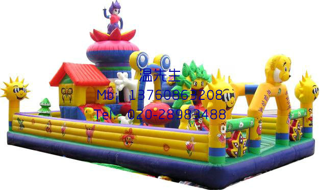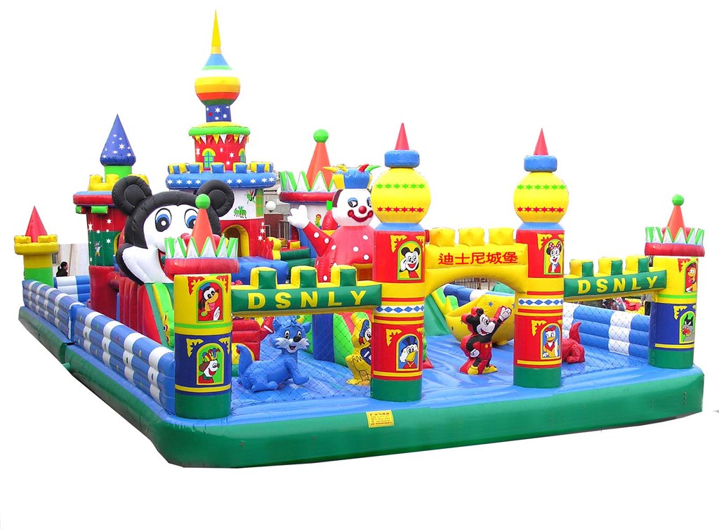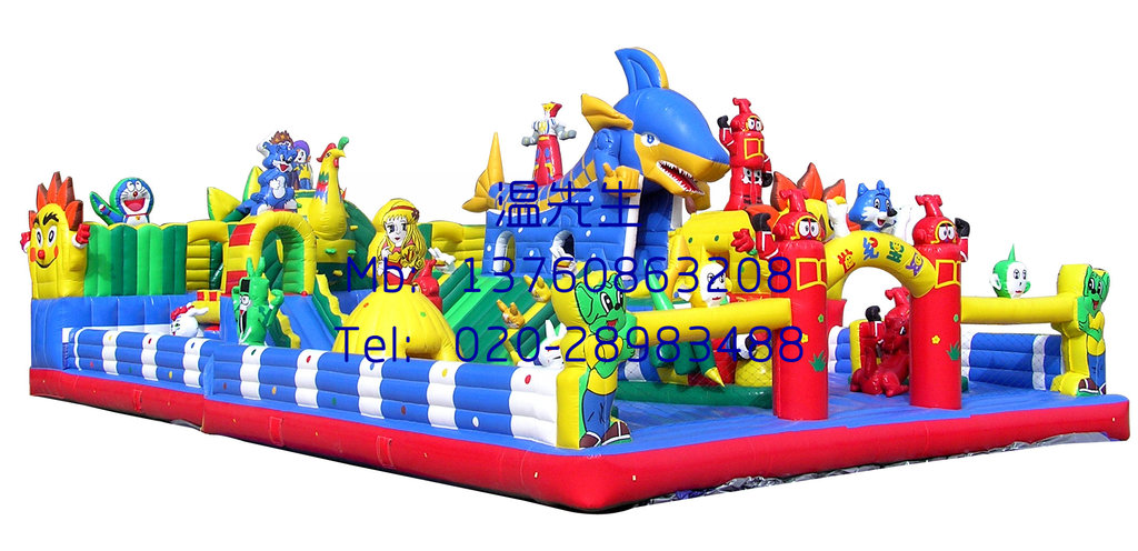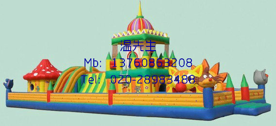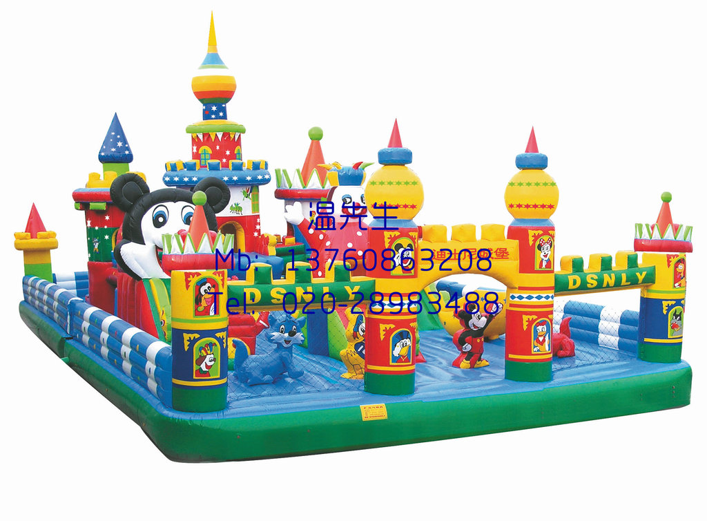 儿童充气弹跳城堡是当前非常流行、可玩性和安全性高、商业空间很大的一种娱乐设施和娱乐项目,它从儿童的生理和心理特性出发而研制,内含滑梯、蹦床、攀岩、迷宫、各式各样的形象卡通动物造型,有丰富的娱乐项目,犹如童话般深受孩子们的喜爱。它具有安全性、综合性、可观赏性、新颖性,色彩鲜明,经久耐用等特性,通过科学的立体组合,采用超强的防水布制作而成,这是一种综合性极强的娱乐乐园。游戏者通过翻、滚、爬、摇、晃、跳、钻等新奇的活动方式,达到开发智力,锻炼身体,愉悦身心的目的。本产品因其随意性和无动力装置受到买家的欢迎,安全可靠,管理简单,维修方便。 材料:本产品采用0.55mmPVC夹网布做成,材料具有无毒、阻燃、环保,1000股交织聚脂纤维双面PVC涂布,抗拉强度3478N,撕裂强度1572N、粘着力188N/5cm,抗寒-30度、抗热+60,提高了其使用寿命。