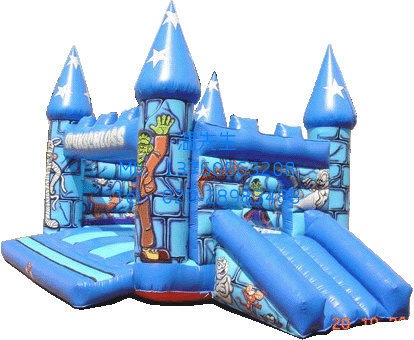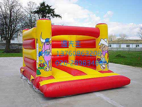 儿童充气弹跳城堡是当前非常流行、可玩性和安全性高、商业空间很大的一种娱乐设施和娱乐项目,它从儿童的生理和心理特性出发而研制,内含滑梯、蹦床、攀岩、迷宫、各式各样的形象卡通动物造型,有丰富的娱乐项目,犹如童话般深受孩子们的喜爱。它具有安全性、综合性、可观赏性、新颖性,色彩鲜明,经久耐用等特性,通过科学的立体组合,采用超强的防水布制作而成,这是一种综合性极强的娱乐乐园。游戏者通过翻、滚、爬、摇、晃、跳、钻等新奇的活动方式,达到开发智力,锻炼身体,愉悦身心的目的。本产品因其随意性和无动力装置受到买家的欢迎,安全可靠,管理简单,维修方便。 材料:本产品采用0.55mmPVC夹网布做成,材料具有无毒、阻燃、环保,1000股交织聚脂纤维双面PVC涂布,抗拉强度3478N,撕裂强度1572N、粘着力188N/5cm,抗寒-30度、抗热+60,提高了其使用寿命。