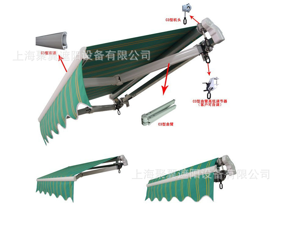 聚翼遮阳篷:它具有体积小,调幅大,结构新颖,美观大方,节能环保的特点。它具备遮阳,挡尘,阻挡热辐射等功效。面料采用新型遮阳面料,防雨,抗霉,抵挡热量和紫外线。适用于家庭,咖啡馆,宾馆,酒店等场所的外遮阳使用,使用摆臂窗蓬可以阻挡60—75%的热辐射,是最理想的门窗户外遮阳精品。