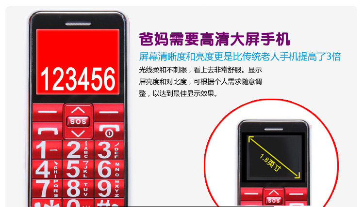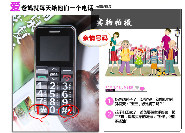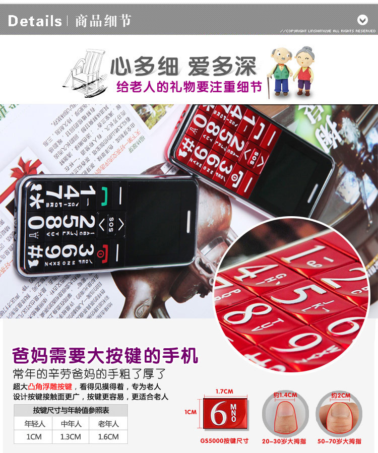 1、超大、凸感立体按键,单个按键面积达到1平方厘米,且按键键位凸出,防止误按,老人使用更方便。