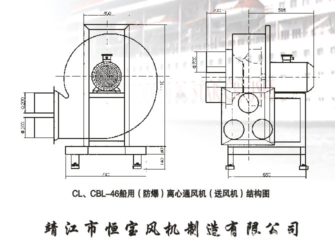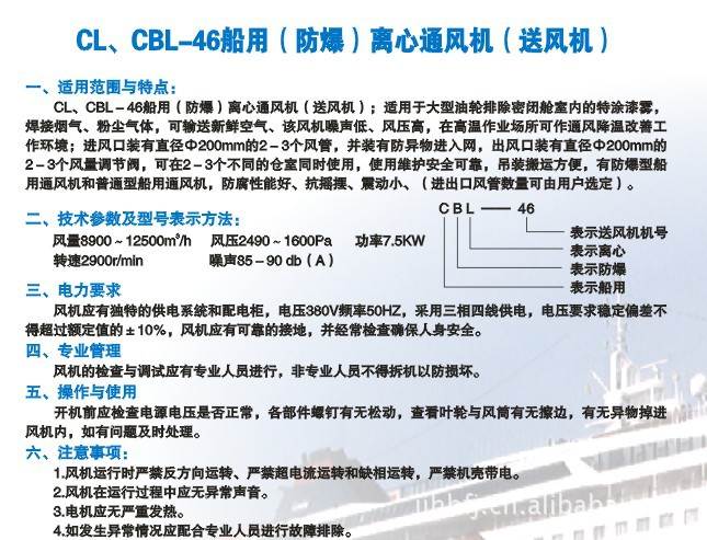 CBL系列船用防爆离心通风机(以下简称“防爆通风机”) 是按照GB11799―89《船用防爆离心通风机》、GB3836―83《爆炸性环境用防爆电气设备》中内容通用要求及2隔爆型电气设备“d”的有关规定和现行的《钢质海船入级和建造规范》的有关规定设计制造的。