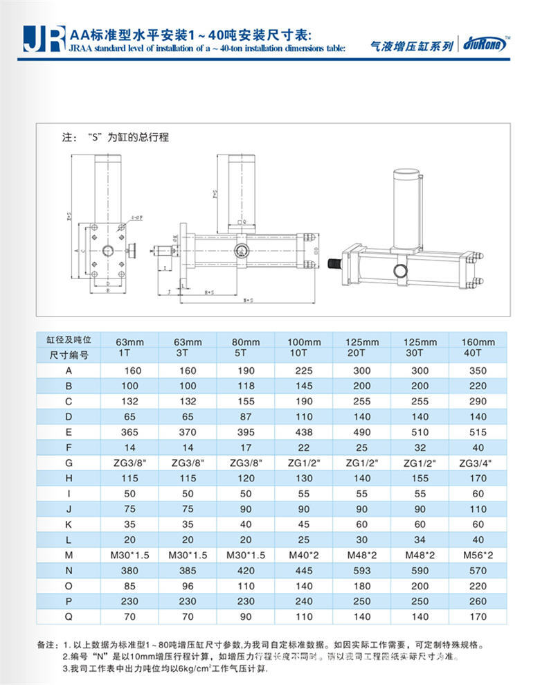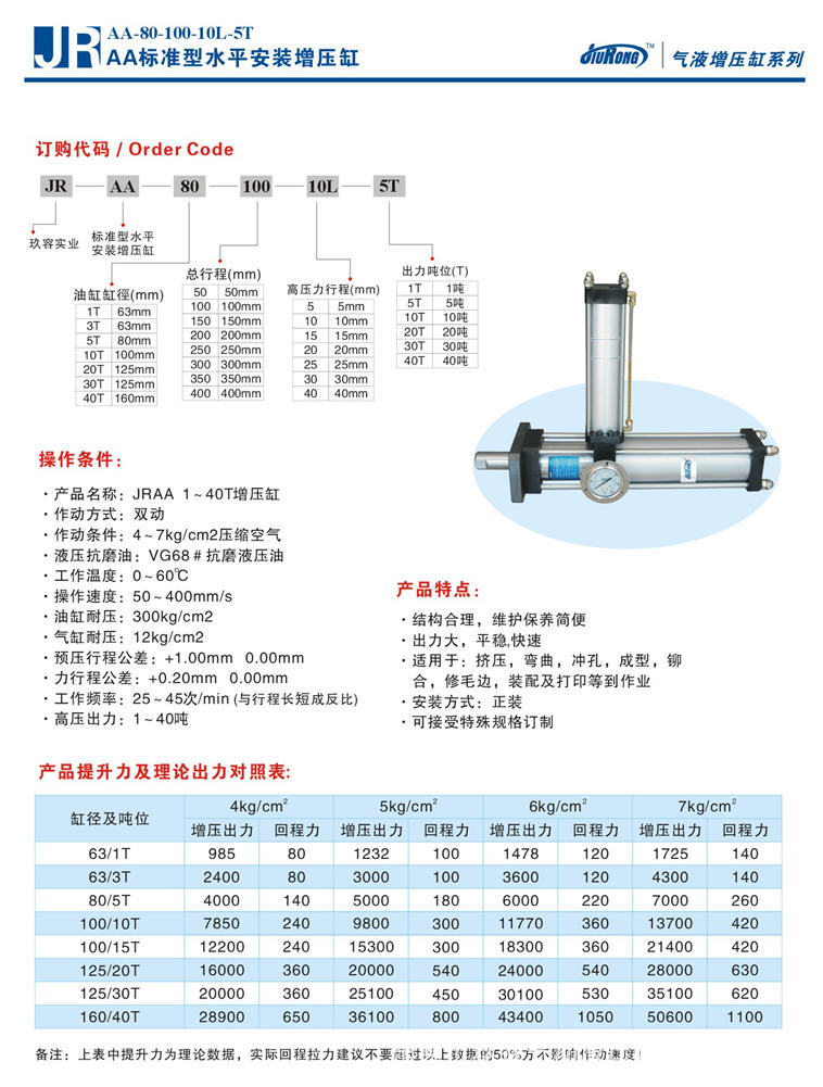 JRAA标准型水平安装增压气缸:本产品结构合理,操作方便,快捷,稳定,出力大。可订制出力1-100吨。安装方式为正装或水平安装。适合:产品冲压,裁断,成型,铆接,装配等工作场合。