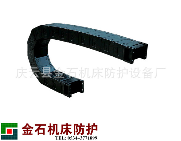 (3)单元链节由左右链板和上下盖板组成,拖链每节都能打开,装拆方便,不必穿线,打开盖板后即可把电缆、油管、气管、水管等放入拖链。