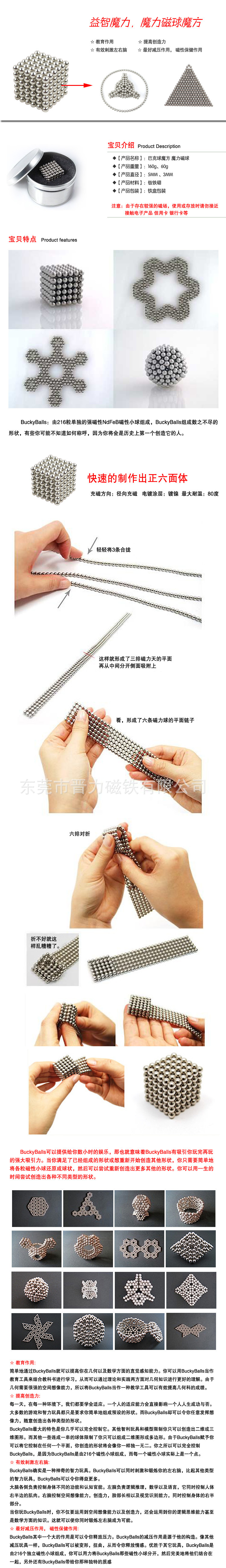 本公司专业生产稀土永磁钕铁硼材料,经过专业球磨机可以磨合成以下尺寸磁球:D3mmD4mmD5mmD6mmD7mmD8mmD9mmD10mmD11mmD12mmD13mmD14mmD15mm,可电镀镀锌镀镍镀银等彩色磁球,欢迎咨询订购!磁性球魔方--它由216块高度磁性稀土钕铁硼材料磨成(单粒磁球直径5毫米),每块磁铁有南北极性。以下是魔方磁球的介绍以及玩法: