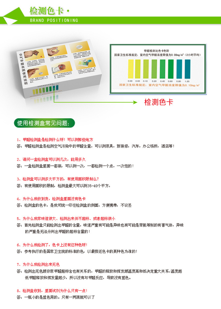 每盒均有防伪标签 ,可拨打400-6066-315电话查询真伪空气甲醛自测盒:,每盒检测一次;适用范围更衣橱、汽车、居室等;特点不需任何设备,可自测,一次性包装 内有详细说明