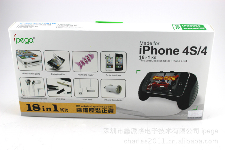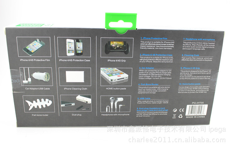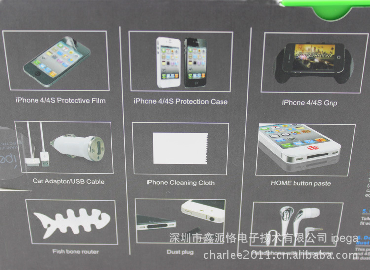 套装包含:iPhone4/4S保护膜×2,iPhone4/4S保护壳×2,车充×1,鱼骨绕线器×1,USB数据线×1,iPhone4/4S手把×1,耳机×1,擦镜布×1,防尘塞×2,HOME按键贴×6。