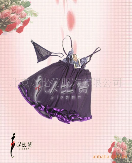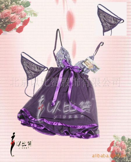 紫色半透明纱质短裙,长度刚及臀部,突出修长的双腿.摇曳的裙摆以同色丝带纤边,增加美感,不易跳线.垂坠在身体上犹如苞待放的睡莲,层层叠含,纯情动人. 低胸设计,胸部前片均以柔软蕾丝制成,波浪边缘,配以精致花朵图案.乳沟处竖向丝带,系成的紫色蝴蝶结,仿佛向你诉说她的脉脉温情。吊裙肩带为可调节的丝带设计,经典的露背剪裁更加显现女性背部完美曲线。丁字小裤,前片为同质地性感透纱,两侧为弹性细带。胯部以松紧带连接,宽度不足1cm。后片仅为一根同样粗细的带子,更有无底设计,可以免去脱衣之劳,享受前所未有的新奇快感!