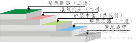 | 施工工艺: | ①防水处理:一楼地面需已做好防水处理; ②素地处理:依素地状况做好打磨、修补、除尘; ③环氧底漆:采用渗透性及附着力特强环氧底漆滚涂一道,增强表面附着力; ④环氧中涂:将环氧树脂加入适量的石英砂,用镘刀将其均匀涂布数道; ⑤环氧批土:依实际需要施工数道,要求达到平整无孔洞,无批刀印及砂磨印为准; ⑥滚面或自流平面漆:用滚面型环氧面漆均匀滚涂二道或自流平型环氧面漆均匀镘涂一道,完工后整体地面达到光亮洁净,颜色均一,无空鼓; ⑦施工完成:24小时后方可上人,72小时后方可重压。(25℃为准,低温开放时间需适度延长)
