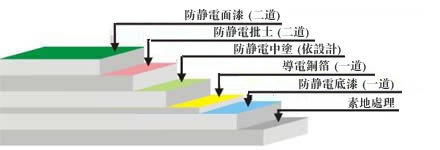 | 施工工艺: | ①防水处理: 一楼地面需已做好防水处理; ②素地处理: 依素地状况做好打磨、修补、除尘; ③防静电底漆:采用渗透性及附着力特强防静电环氧底漆滚涂一道,增强表面附着力; ④防静电中涂:防静电中涂将环氧树脂加入适量的石英砂,用镘刀将其均匀涂布一至二道; ⑤铜箔铺设: 导电铜箔采用井型铺设,有效排除累积之静电,并做接地处理; ⑥防静电批土:防静电批土依实际需要施工数道,要求达到平整无孔洞,无批刀印及砂磨印为准; ⑦防静电面漆:防静电面漆滚涂二道,其体积/表面电阻平均系数值1X10^5~1X10^8Ω,工后整体地面光亮洁净,颜色均一,无空鼓; ⑧施工完成: 24小时后方可上人,72小时后方可重压。(25℃为准,低温时开放时间需适度延长)