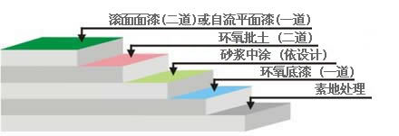 | 厚 度: | 0.5mm 0.8mm | | 表面形态: | 亮光型亚光型桔皮型 | | 使用年限: | 0.5mm4年以上 0.8mm6年以上 | | 产品特性: | 平坦无缝、防霉抗菌、耐磨耐压、耐酸耐碱、耐化学药品、颜色多样、清洁容易、经久耐用、抗冲击力强。 | | 适用范围: | 电子厂、制衣厂、手袋厂、化妆品厂、卷烟厂、GMP药品厂、食品加工厂、各种轻工业加工厂等。 | 施工工艺: | ①防水处理:一楼地面需已做好防水处理; ②素地处理:依素地状况做好打磨、修补、除尘; ③环氧底漆:采用渗透性及附着力特强环氧底漆滚涂一道,增强表面附着力; ④环氧中涂:将环氧树脂加入适量的石英砂,用镘刀将其均匀涂布数道; ⑤环氧批土:依实际需要施工数道,要求达到平整无孔洞,无批刀印及砂磨印为准; ⑥滚面或自流平面漆:用滚面型环氧面漆均匀滚涂二道或自流平型环氧面漆均匀镘涂一道,完工后整体地面达到光亮洁净,颜色均一,无空鼓; ⑦施工完成:24小时后方可上人,72小时后方可重压。(25℃为准,低温开放时间需适度延长)