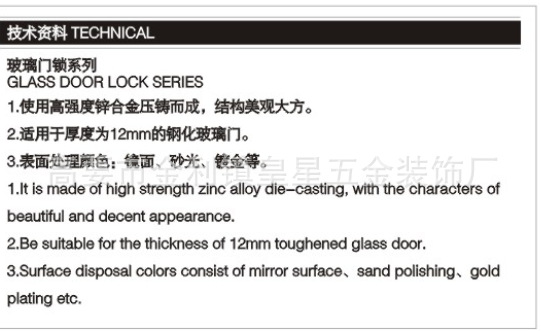 1,本玻璃门锁适用于厚度为10mm-12mm的钢化玻璃门;