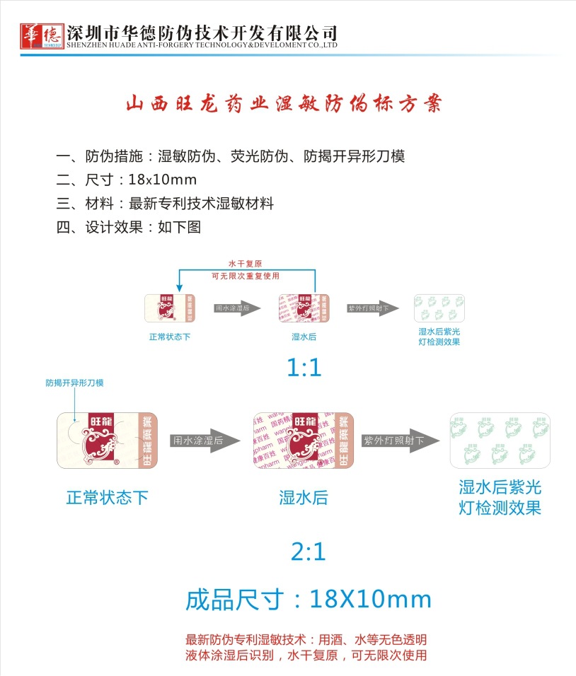 旺龙药业防伪标签采用我公司专利湿敏防伪技术,此技术拥有以下特性: