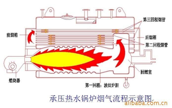 燃气热水锅炉为锅壳式全湿背式烟火管结构,该锅型采用三个回程,油或气经燃烧器良好雾化后与空气充分混合,在波纹炉胆中完全燃烧,由后烟室折转180度进入第一回程烟管,至前烟箱转到第二回程烟管,最后进入后烟箱,由烟囱排出。